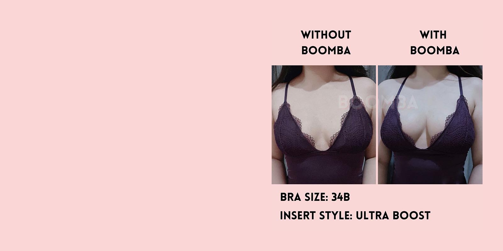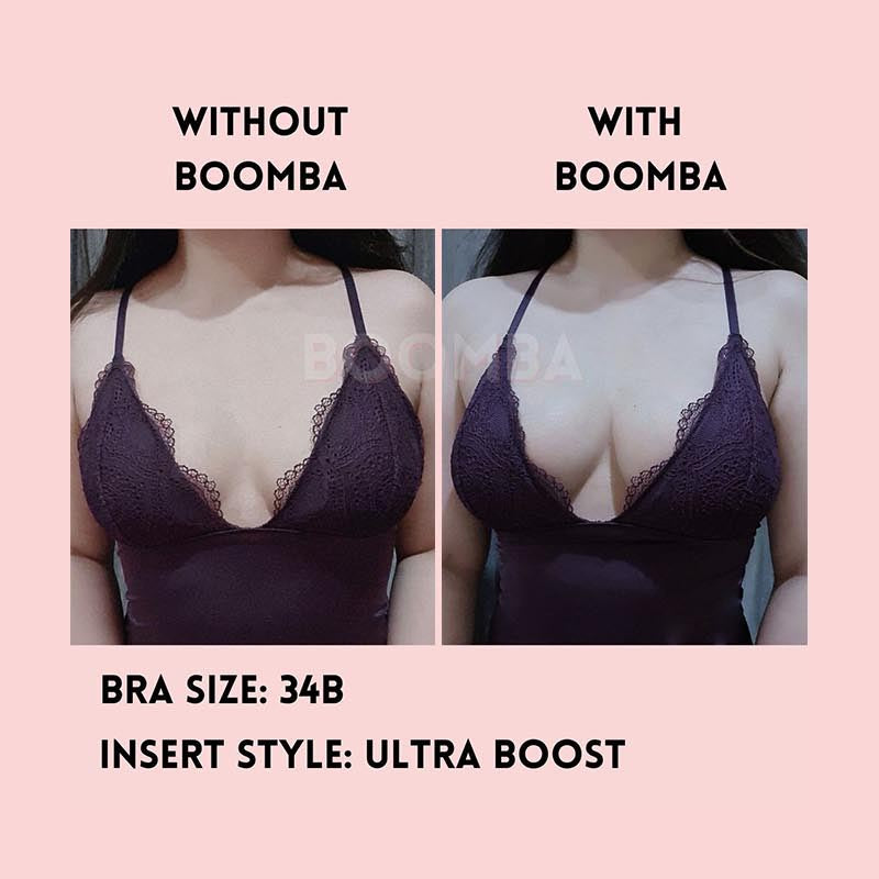 Please note that results may vary depending on breast size and shape. Results will be similar to a double push-up bra. BOOMBA results work best with natural breasts. Demi Boost & Invisible Lift Inserts come in two sizes (small and medium). Size small is suitable for cup sizes A / B / C and size medium is suitable for sizes D / E and Ultra Boost Inserts come in different cup sizes.