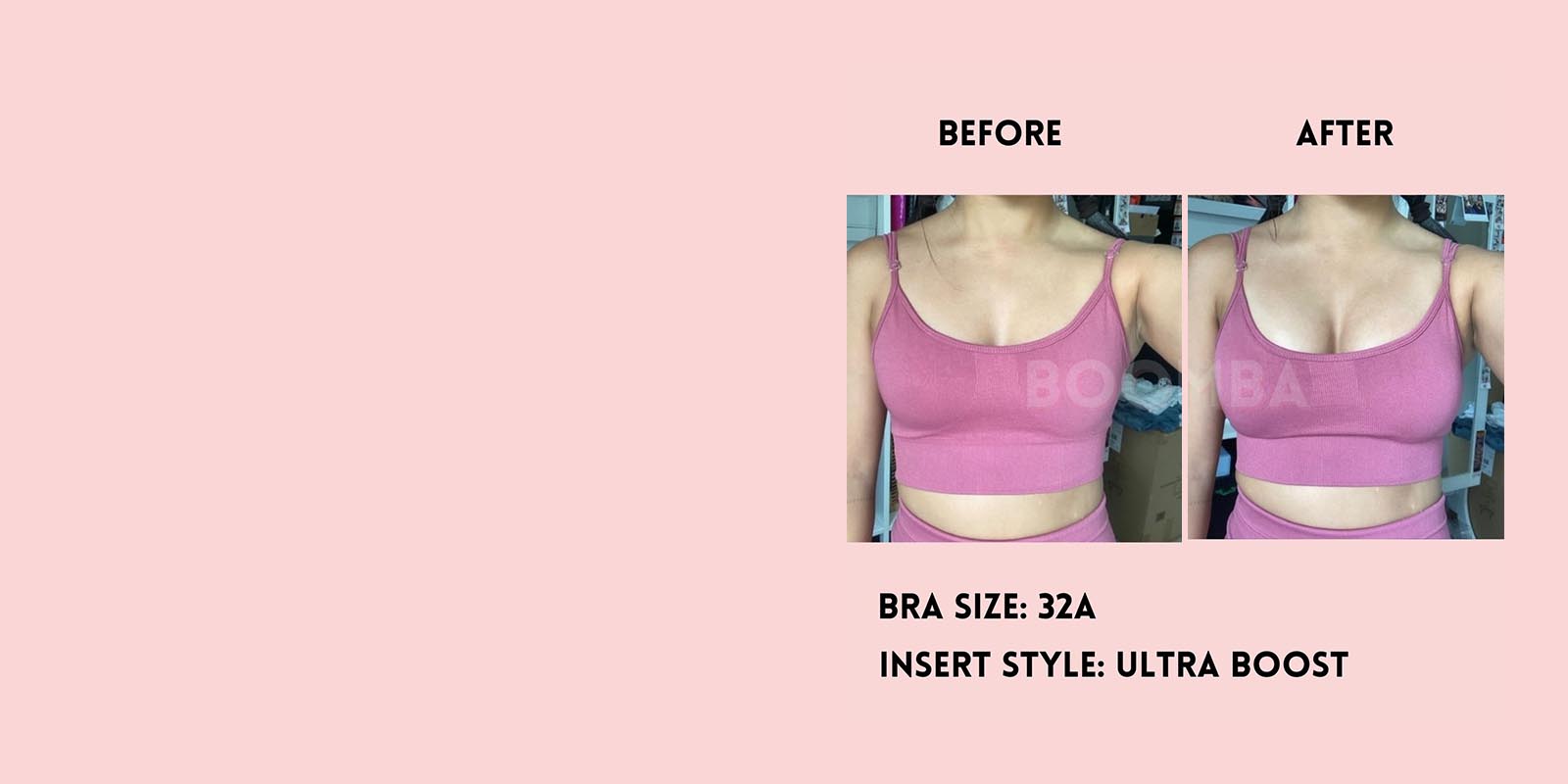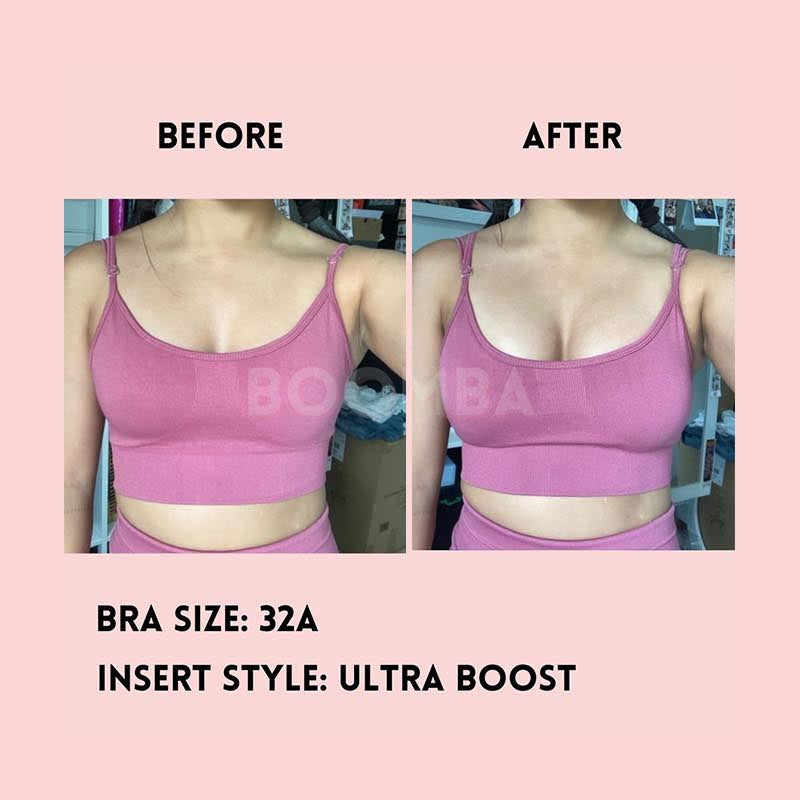 Please note that results may vary depending on breast size and shape. Results will be similar to a double push-up bra. BOOMBA results work best with natural breasts. Demi Boost & Invisible Lift Inserts come in two sizes (small and medium). Size small is suitable for cup sizes A / B / C and size medium is suitable for sizes D / E and Ultra Boost Inserts come in different cup sizes.