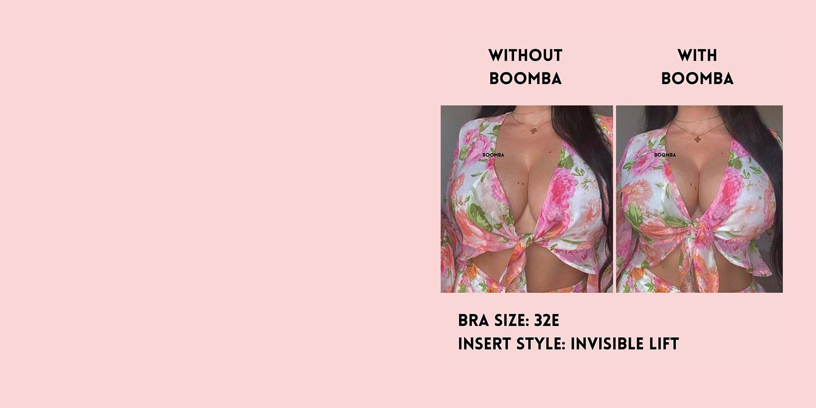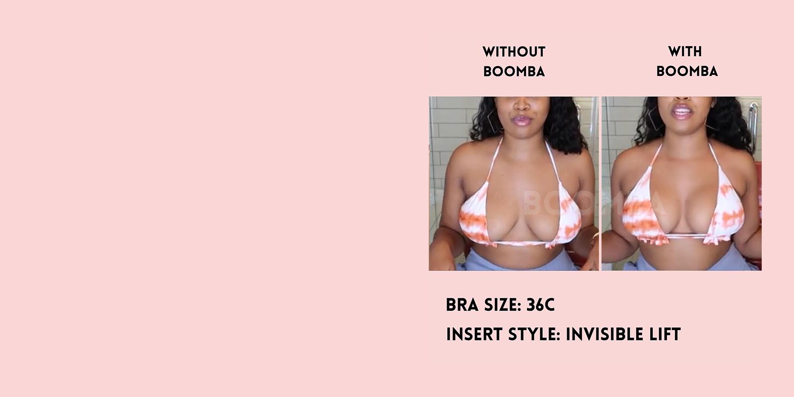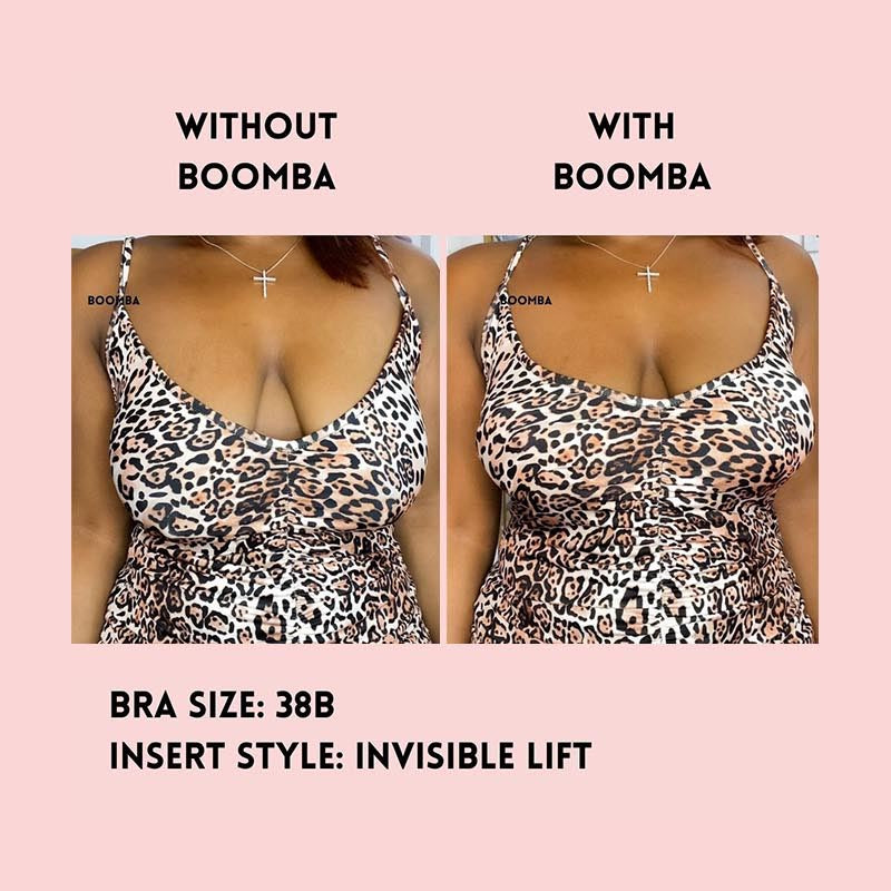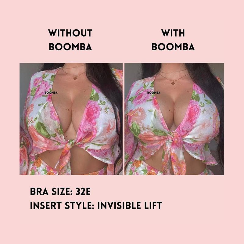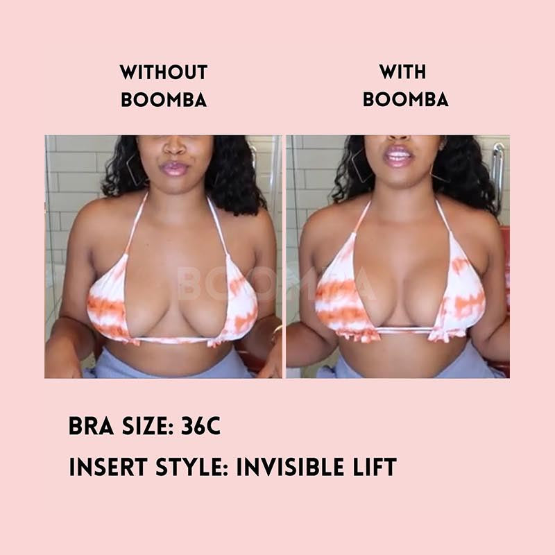 Please note that results may vary depending on breast size and shape. Results will be similar to a double push-up bra. BOOMBA results work best with natural breasts. Invisible Lift Inserts come in two sizes (small and medium). Size small is suitable for cup sizes A / B / C and size medium is suitable for sizes D / E.